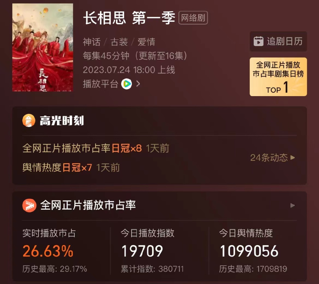 开播一周,这部剧的确展现了头部爆款该有的市场效应。更宏观的,腾讯视频站内热度破32000;灯塔全网正片播放市占率达29.17%,仅次于《狂飙》《长月烬明》;微博上,主话题#长相思#阅读量达111亿,#杨紫长相思#阅读量达168亿;抖音上,剧集同名主话题播放量突破90亿。