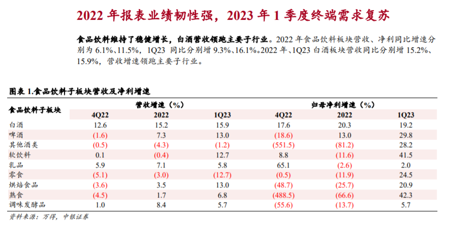 进入2023年之后,白酒行业的景气还在继续。中银证券指出,2023年Q1,随着复苏次第展开,白酒营收、净利同比增速分别为15.9%、19.2%,并给出了白酒行业“强于大市”的预测。