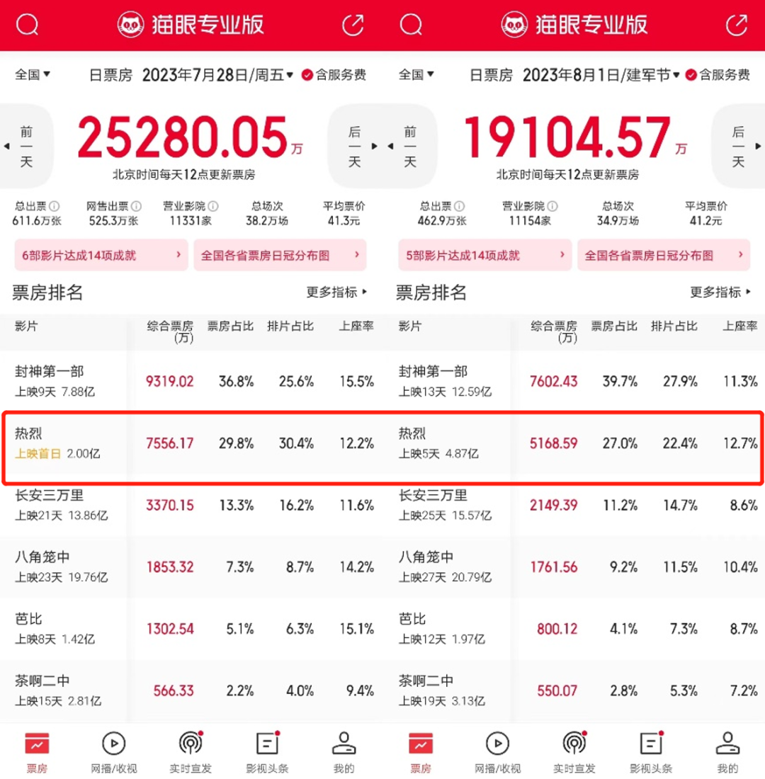 然而,猫眼专业版数据显示,截至8月1日,《热烈》上映5天累计票房尚未突破5亿。且从排片表现来看,影片凭借破亿的点映和预售表现,曾在上映首日拿到超30%的排片,但票房还是被同期在映的《封神》压了一头。随后,猫眼将《热烈》的票房预期下调至13亿左右。