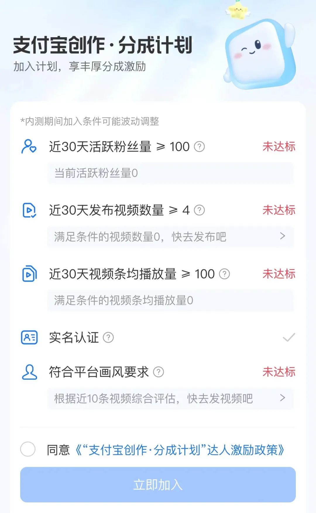 新榜编辑部了解到,支付宝创作分成计划上线于6月底,创作者满足粉丝量、视频数量、播放量等相应条件即可加入该计划。