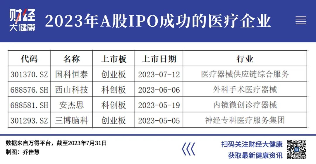 《财经·大健康》根据公开信息统计,2023年前7个月,A股共有有4家医疗企业成功IPO,24家终止IPO:其中20家因企业主动撤回而终止,2家因审核不通过而终止,还有2家终止审核。