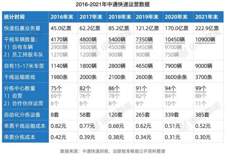 但在“三通一达”都成功上市后,王卫却开始急了。最显著的变化是,“三通一达”在资本的支持下,开始加快了基础设施的建设,以中通为例,它的自营车辆从2016年4170台增加至2021年的10900台,自动化分拨设备也从2016年的8套增加到2021年的385套。
