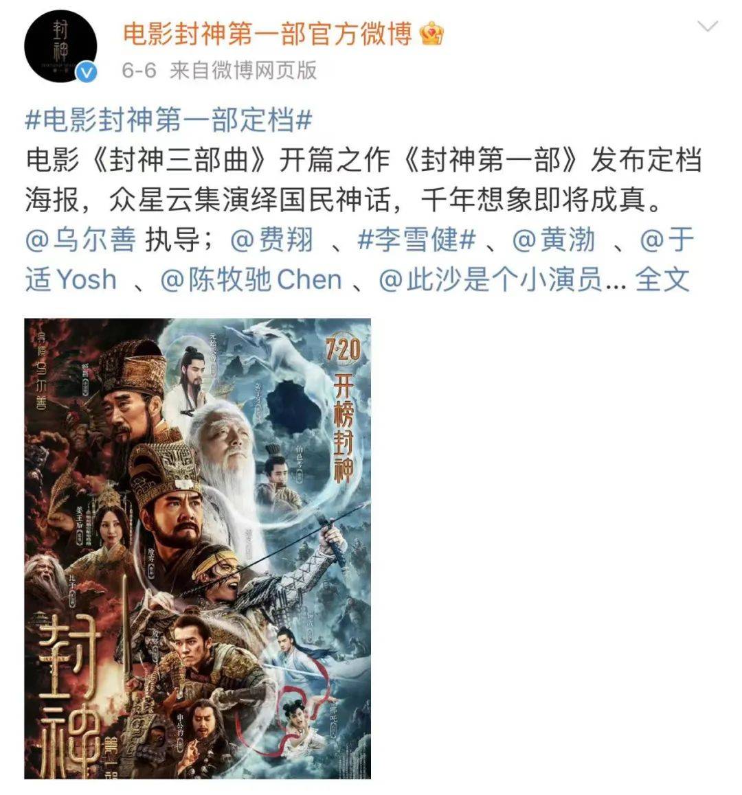 《封神三部曲》按部就班在2018年至2019年拍摄,原计划在2020年、2021年、2022年分别上映,却不想遭遇了资方北京文化的暴雷和猝不及防的疫情冲击。之后被迫化身“气候博主”发了两三年的节气海报,直至今年5月下旬才开始正式启动映前宣发工作,并于6月6日宣布定档。