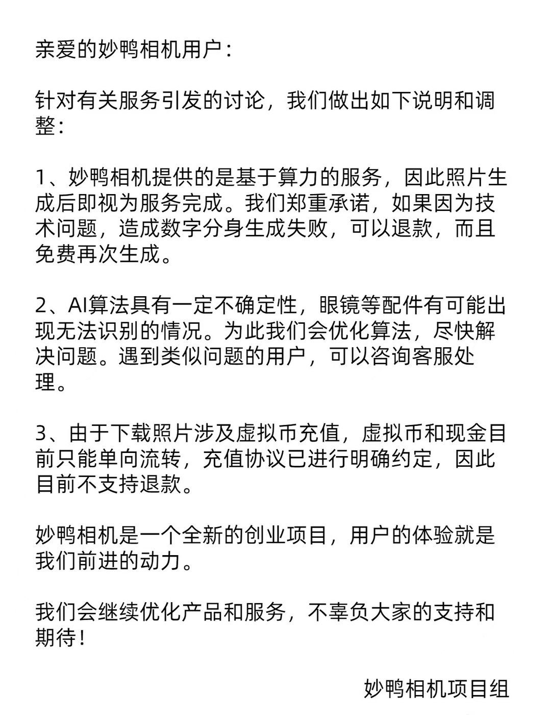 比如随着热度一起上升的,关于用户体验不佳的评价,暴露出了一些运营短板。如果说生成照片动辄排队半天以上,还能有些饥饿营销的效果,那生成不满意不予退费,让不少消费者难以接受。在上海市消费者权益保护委员会发声表示谴责后,妙鸭相机运营方于7月27日回应了退款风波,并增添优化退费说明。