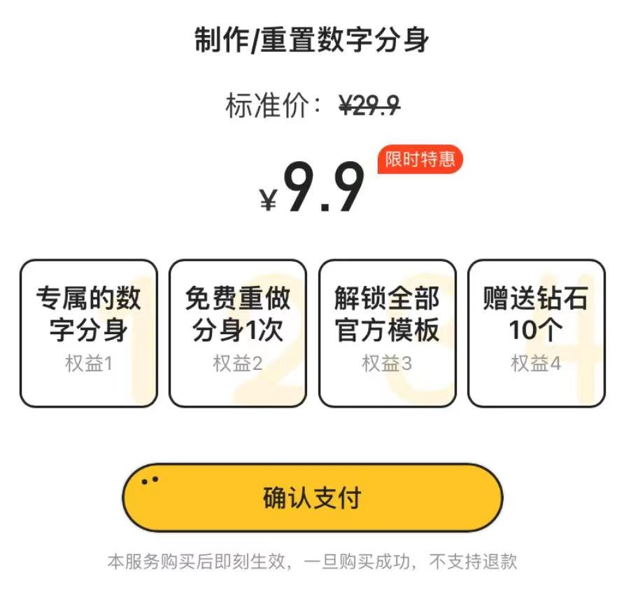 除了生成固定格式的人像图片以外,分身再难有任何操作空间,只是官方会根据流行趋势提供更多模板。这种单一的消费模式很难培养长期用户,也少有复购需求。