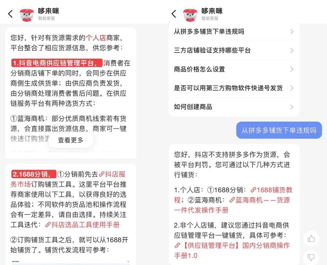 针对没有货源的个人店商家,抖音推出两个货源平台:抖音电商供应链服务平台和1688平台。不过有商家反映,当前抖音电商供应链服务平台上的商品种类不够丰富、价格也偏高,1688、淘特、拼多多是抖音平台无货源商家较为常用的拿货渠道。目前抖音已经明令禁止拼多多作为店铺货源。![]()