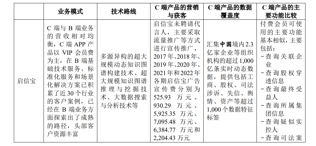 在招股书中,合合信息也将启信宝与其他竞品进行横向对比,将市场占有率低的原因归结于“未能在确定竞争格局的早期阶段大规模进行营销推广”。