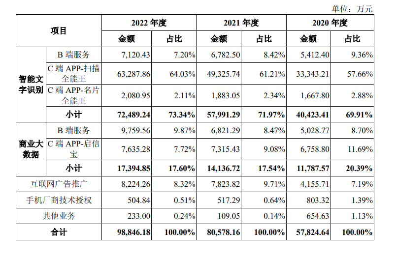 作为一家人工智能及大数据科技企业,合合信息业务以B端智能文字识别与商业大数据服务和C端扫描全能王APP、名片全能王APP、启信宝APP等产品双轮驱动。