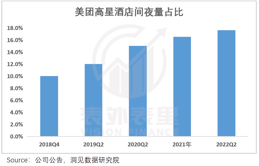 反映在数据上,2020Q2美团高星酒店间夜量占比超过15%,但发展两年后,仅增长不到三个点——2022Q2占比17.6%。
