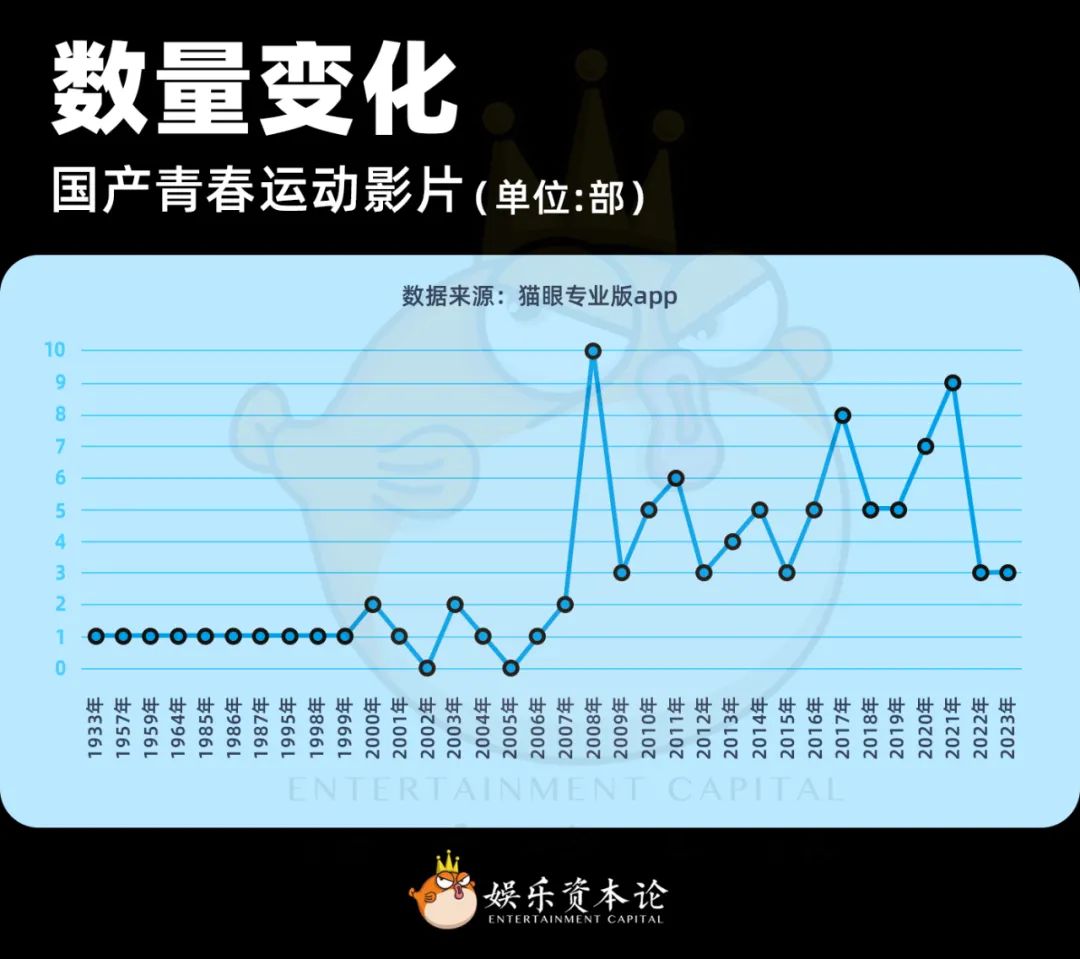 从阶段上来看,国产青春运动片的起步较晚。尽管在1933年,国内就有了第一部足球题材的电影《二对一》,但在2000年以前,国产青春运动片仅10部。