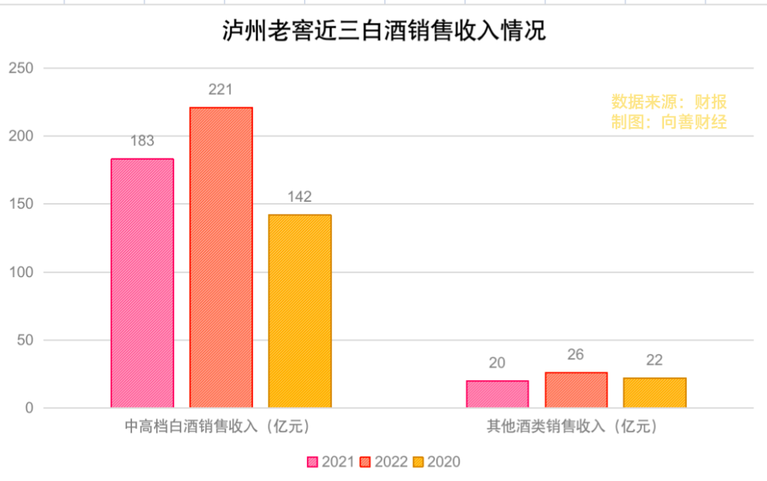 高端酒放量,带动了泸州老窖销售收入大幅增长。2020年到2022年泸州老窖中高档白酒销售收入从142亿增长到了221亿。