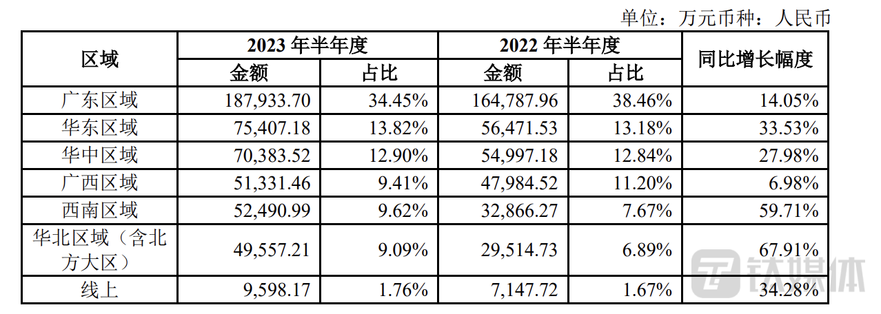 分地区看,西南区域、华北区域增速较为明显,上半年分别实现营收5.25亿元、4.96亿元,同比增速分别达59.71%、67.91%;主力市场广东区域的增速相对较慢,其实现营收18.79亿元,同比增长14.05%。