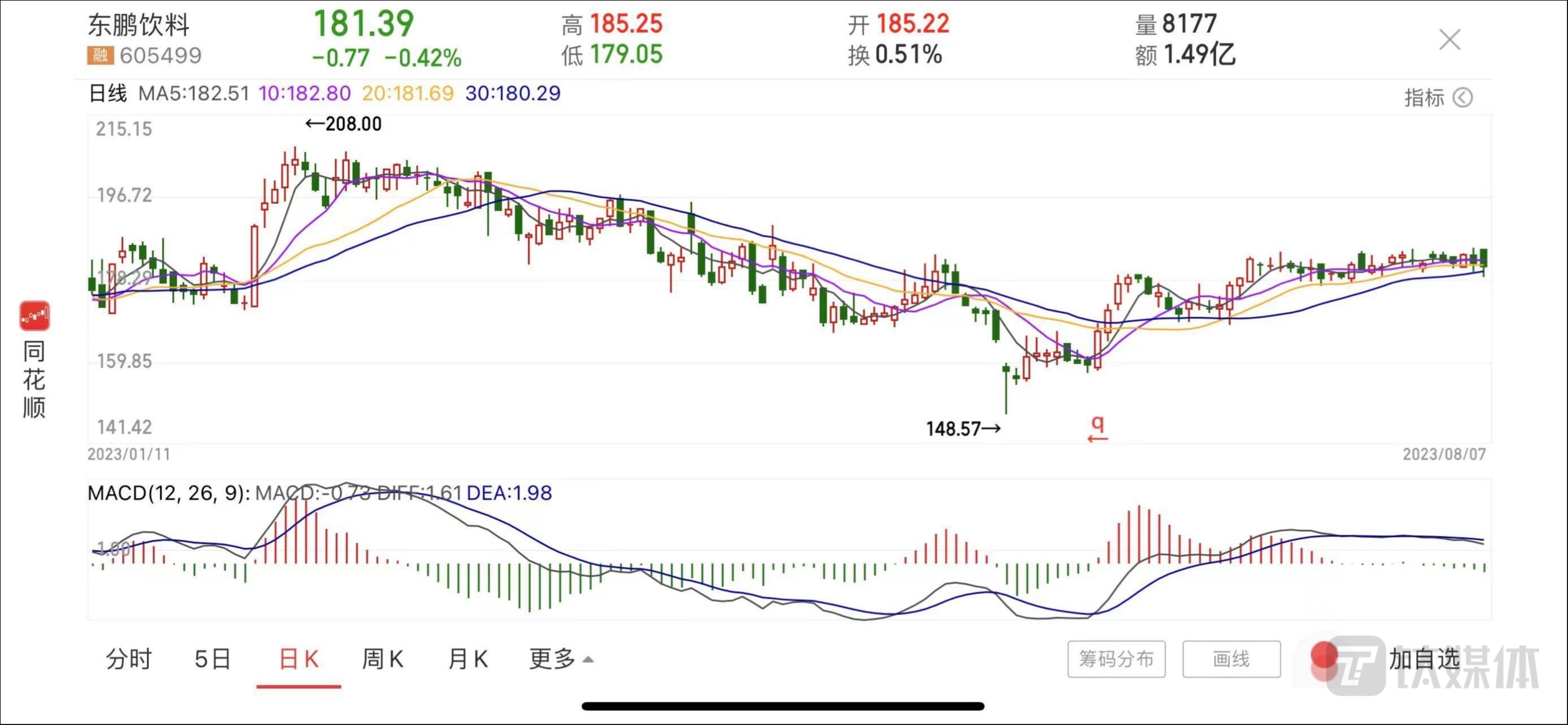 二级市场方面,东鹏饮料的股价在5月30日创下2023年新低,为148.57元,随后触底回升。截至8月7日收盘,公司股价报收181.39元,跌幅为0.42%,当前总市值为725.6亿元。