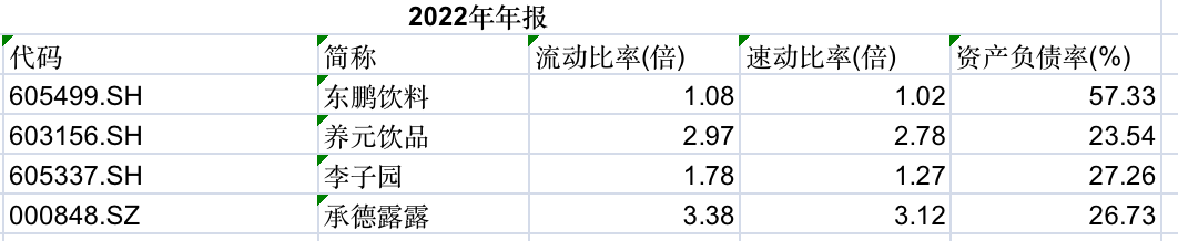 速动比率方面东鹏饮料也低于同行。截至2022年末,东鹏饮料的速动比率为1.02,低于养元饮品的2.78、李子园的1.27、承德露露的3.12。