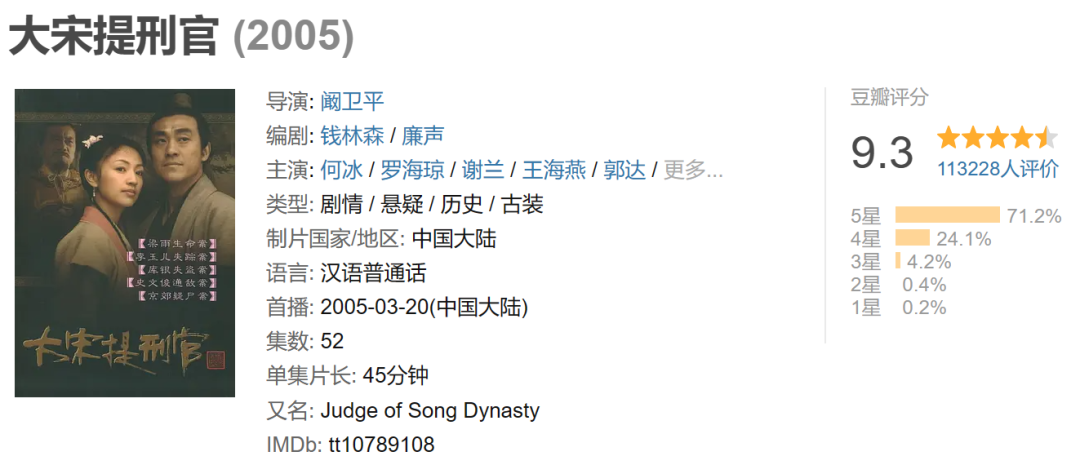 当时,古装悬疑剧多走历史正剧的创作路线,剧中涉及的主人公包拯、宋慈、狄仁杰等都是历史中真实存在的人物。且在剧情搭建上,《神探狄仁杰》系列、《大宋提刑官》等都将探案与国家命运连接起来,尤其是后者所处的南宋时期一片混乱衰败,国家兴亡的重大命题与悬疑的结合,更见此类作品的严肃性和创作高度。