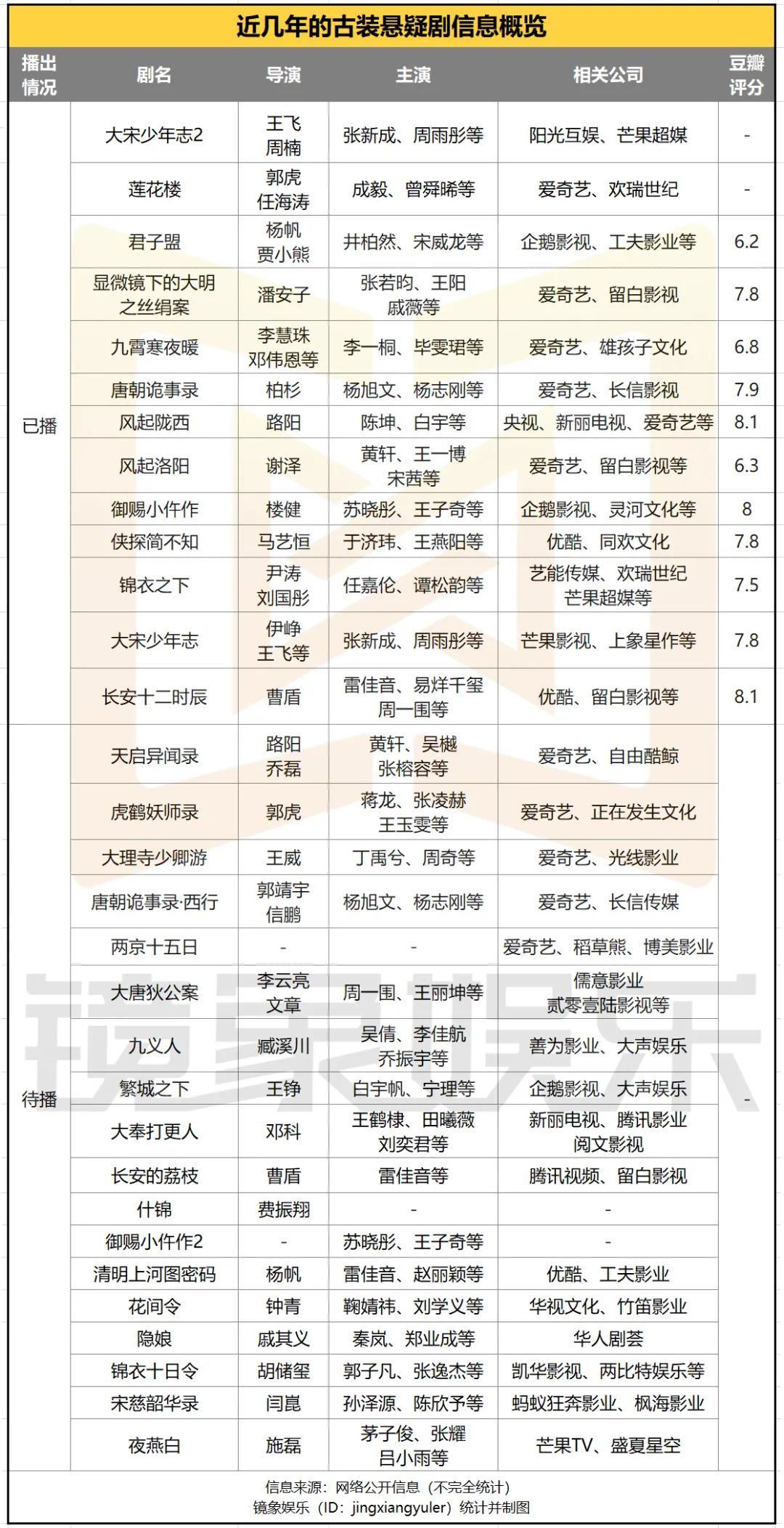 相比之下,优酷储备的古装悬疑剧也不在少数。平台将与工夫影业合作《清明上河图密码》,由雷佳音、赵丽颖等担当主演;与华视文化等合作《花间令》;推出由秦岚主演的女性探案剧《隐娘》等。芒果TV则在《大宋少年志》系列之外,还储备了《夜燕白》等作品。