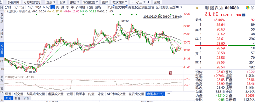 7月15日,顺鑫农业发布2023年半年度业绩预告,预计上半年归母净利润亏损5500万至1.1亿元。