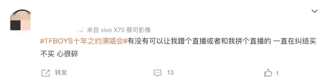 演唱会还没开始,就有人按耐不住在社交平台上发帖求拼,希望找到“演唱会搭子”一起在腾讯会议上看直播。只要发帖“TFBOYS十年周演唱会,腾讯会议直播,人数有限,先到先得”,评论区就会瞬间被无处可去的帝国姐姐们的“求带”“蹲会议号”刷屏。