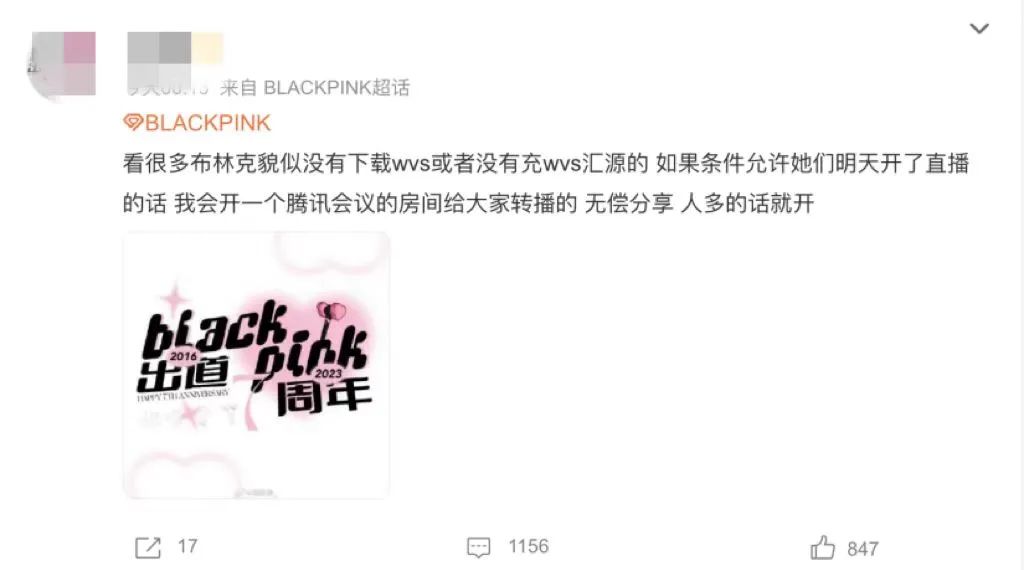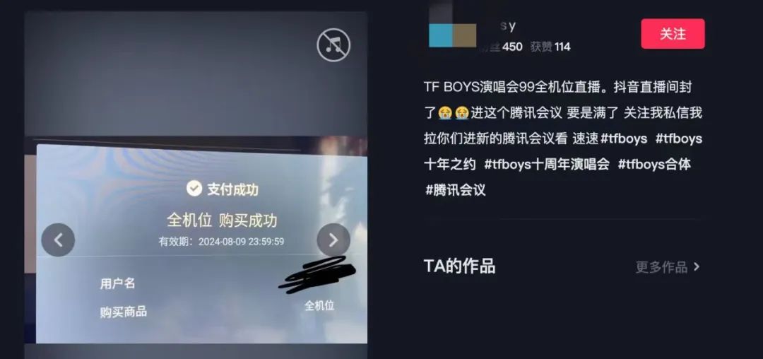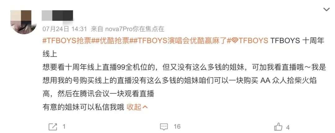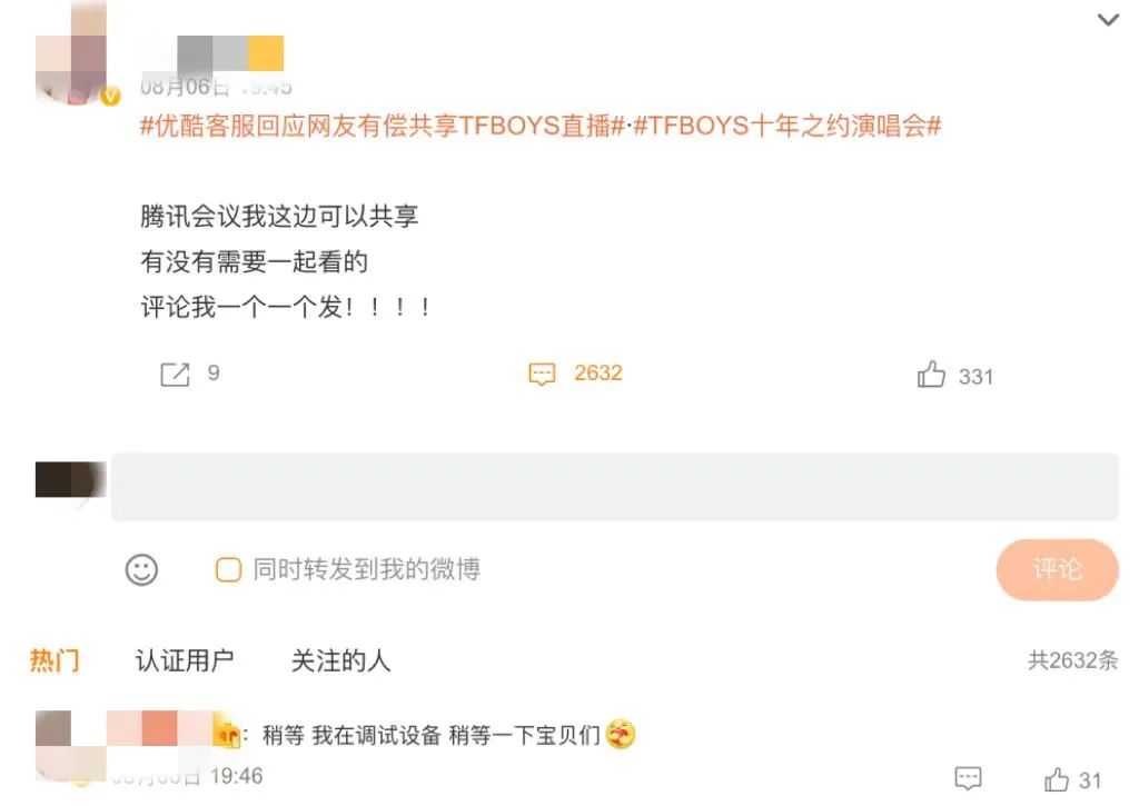 即使是在演唱会期间,在社交平台上发帖,“TFBOYS十年周演唱会,腾讯会议,需要的姐们进来看看”,再贴上会议号,不设密码,不一会儿,房间就挤满前来看演唱会的人。