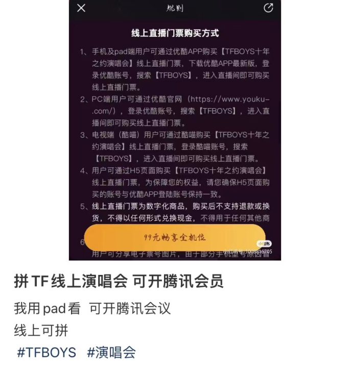实际上,在TFBOYS演唱会之前,腾讯会议就被一些人当作是线上演唱会拼单的“最佳工具”,拼友们或者共同承担版权费,或者免费拼看。
