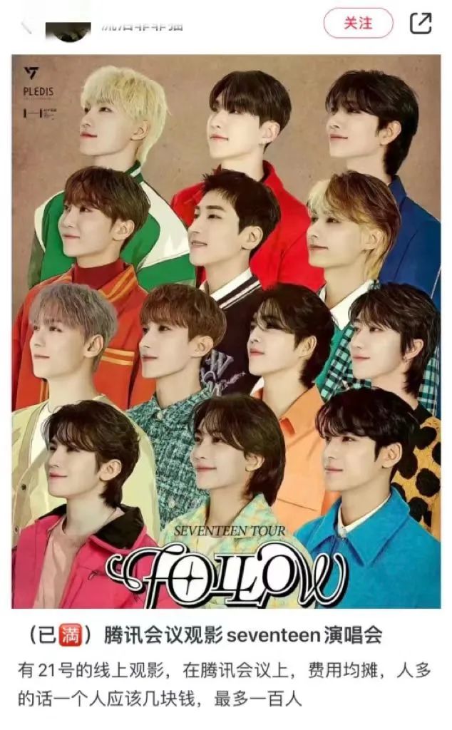 在社交平台上搜索“腾讯会议演唱会”就能发现,似乎任何演唱会都逃脱不了被粉丝用“腾讯会议转播”的命运,Seventeen演唱会、Netjames演唱会、SM演唱会、BTS演唱会的拼单消息比比皆是,来蹲直播间的人还不少,不少网友发帖后很快报名人数就满了,只能无奈截止。