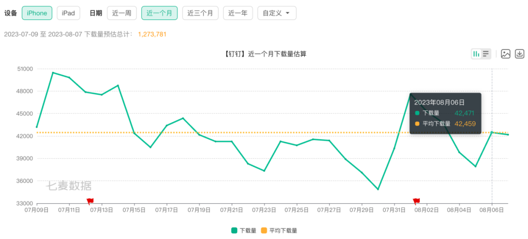 只不过与被送上热搜成为演唱会薅羊毛重灾区的腾讯会议相比,钉钉在当日的下载量并没有迎来下载高峰,在社交平台上的讨论声量也不如腾讯会议。七麦数据显示,钉钉的iPhone设备下载量在当天并没有较大增长。