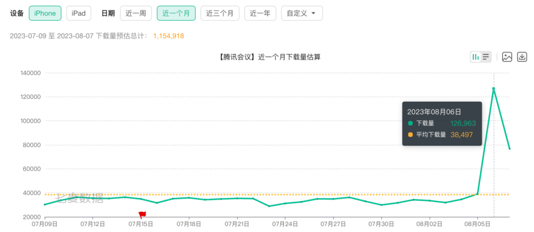 七麦数据显示,8月6日,腾讯会议iOS系统当天下载量就达到近20万。其中,iPhone设备就达到了12.6万,几乎是近30天日均3.7万下载量的4倍。