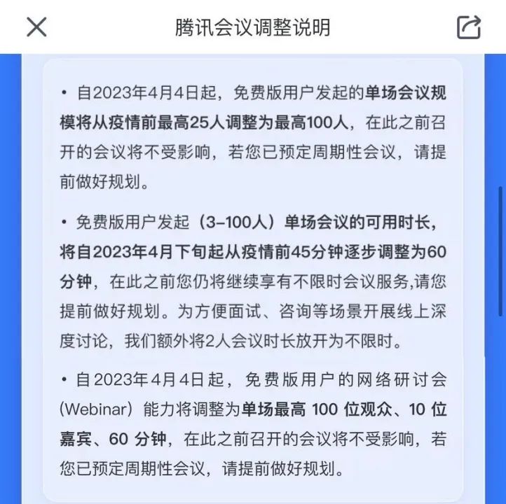 理想很美好,现实很骨感。很快,就有粉丝发现问题了,腾讯会议100人免费会议是限时的。
