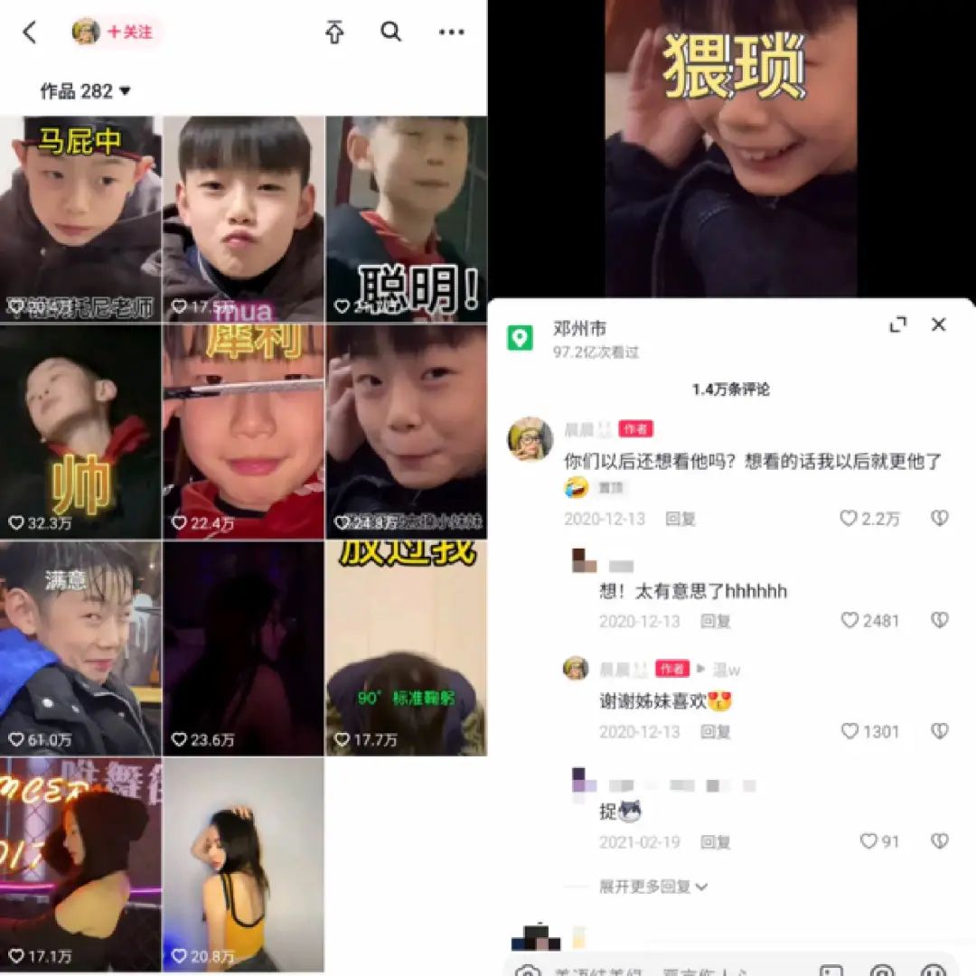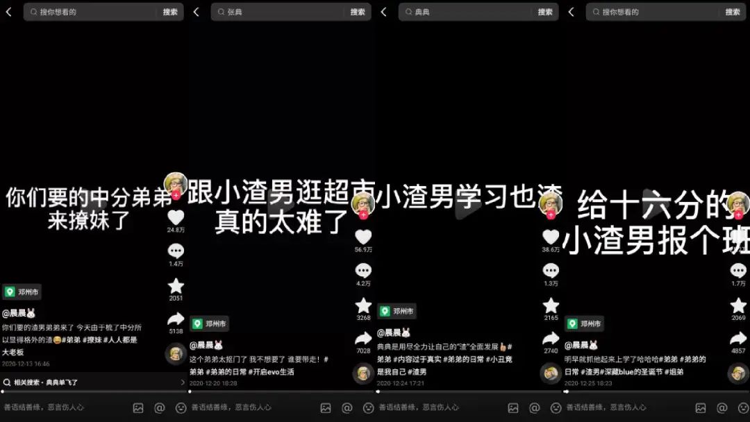 张典虽然年纪小,但却已经有了“偶像包袱”,非常在意自己在女生眼中的形象。因此,“晨晨”瞄准了“小渣男”人设创作了多条视频。