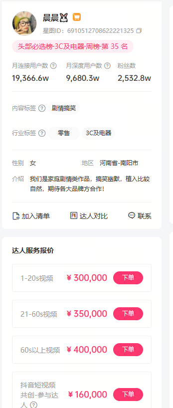 星图数据显示,“晨晨”简介中写着“家庭剧情类植入比较自然”,其抖音每条广告报价在16万至40万之间。据观察,该账号接到了多条数码、家电、互联网App和美妆等各大品牌的广告。