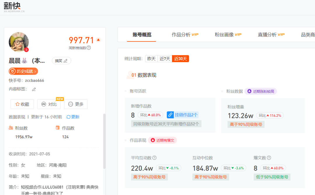 新榜旗下数据工具新抖和新快显示,“晨晨”抖音近三个月视频平均获赞达144万,快手近一个月平均互动数超220万。