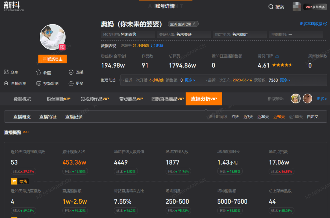 今年5月开始,“典妈(你未来婆婆)”频繁开播,以直播聊天为主,偶尔挂上家清零食等低客单价商品的链接。新抖数据显示,该账号近三个月累计场观超453万,直播预估销售额在1万至2.5万元之间。