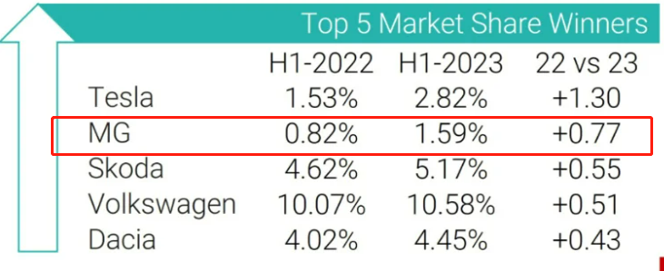 今年上半年,上汽名爵下的MG4 EV、MG5 EV等在欧洲卖了11.5万辆,一半以上是纯电、插电混动,这个数字已经可以与欧洲排第一的特斯拉掰手腕了。
