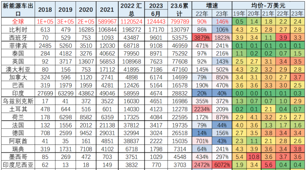 2022年,中国出口到欧洲的汽车销量占比为26.2%,但2023年上半年,权重一下子提到了39.1%。当然,如果按出口金额算的话,出口到欧洲国家的汽车单价在2.5-3.5万美元间,远远高于排名第二的墨西哥的1.1万美元,沙特的1.7万美元,菲律宾的0.7万美元,智利的1.4万美元。