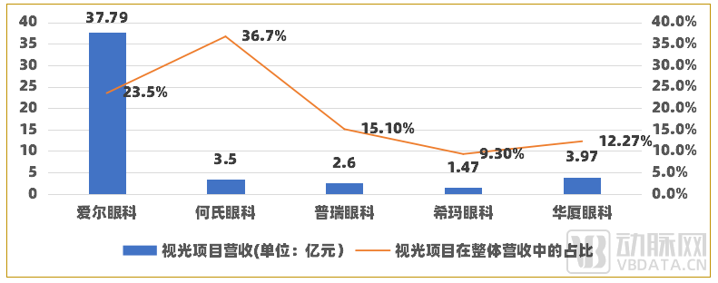 部分上市企业视光业务收入在整体营收中的占比 动脉网根据公开资料制图