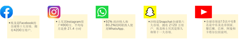 中东地区用户的线下娱乐项目相对局限,因此他们在社交媒体上会投入大量时间,GlobalWebIndex的研究表明,中东和非洲地区范围内的社交媒体用户,每天在社交网络上花费时间超过3.5小时,位居全球前列。中东地区的网民平均每人拥有8.4个社交媒体账户,阿联酋的人均帐户更是达到10.5个,全球最高。