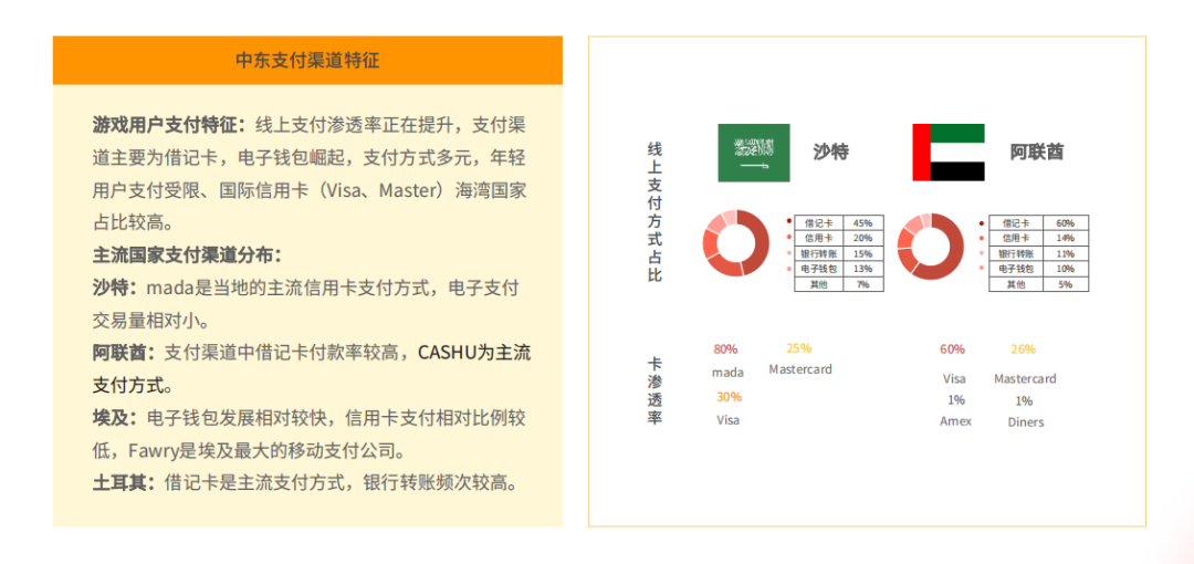 由此可见,中东北非地区不同国家之间差异巨大,支付环境较为分散、复杂,银行卡、信用卡、电子钱包在各个国家的普及率各有不同,支付渠道的本土化能力、适用渠道多寡、手续成本及风控模型,是出海玩家进入中东市场成败因素之一。