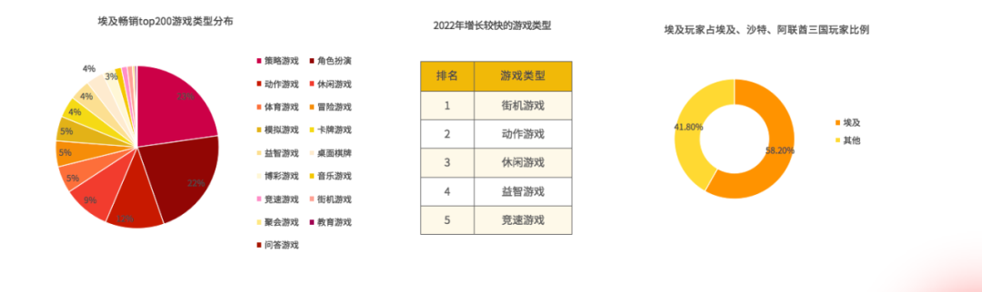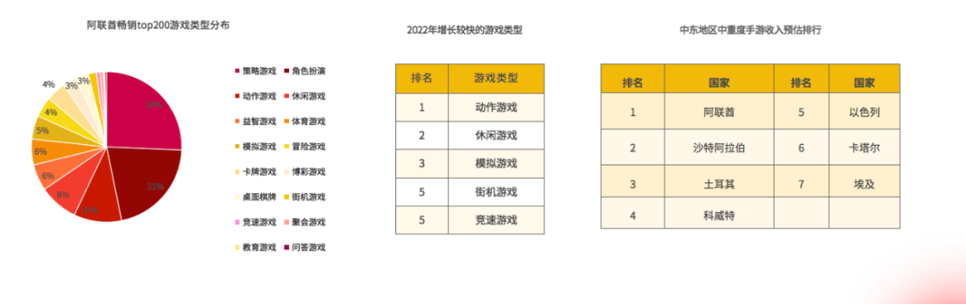 在海湾六国的高质量市场,除了传统优势赛道,街机、模拟经营、休闲类类型游戏增长较快,是中国厂商擅长目前竞争强度略低的赛道,可以进行一定程度的本土化触达玩家。