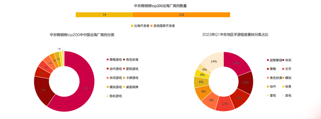在赛道方面,国内出海厂商所在赛道种类日趋多元化。在畅销榜TOP200的出海游戏SLG中,国内出海厂商占据超过50%;且前30中有8个席位是中国厂商,优势明显。动作、角色扮演游戏也在不断发力,比例不低。目前国内出海厂商在中东地区投放最多的游戏类型是益智、休闲、策略、文字类游戏。