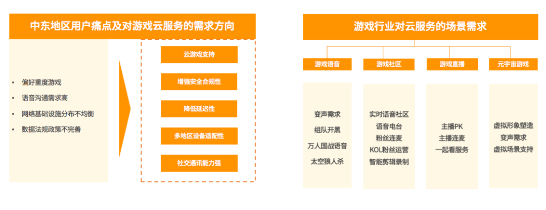 中东地区偏好重度游戏,大部分SLG游戏都重度偏好语音沟通,相比之下,实时语音社交对即时性和稳定需求更为强烈。中东流行的语聊房社交形态也多搭载小游戏。这类泛娱乐功能的即时性提供和功能集成,及同时在线、抗压能力上,需要通用、安全、成本、体验、效率兼备。