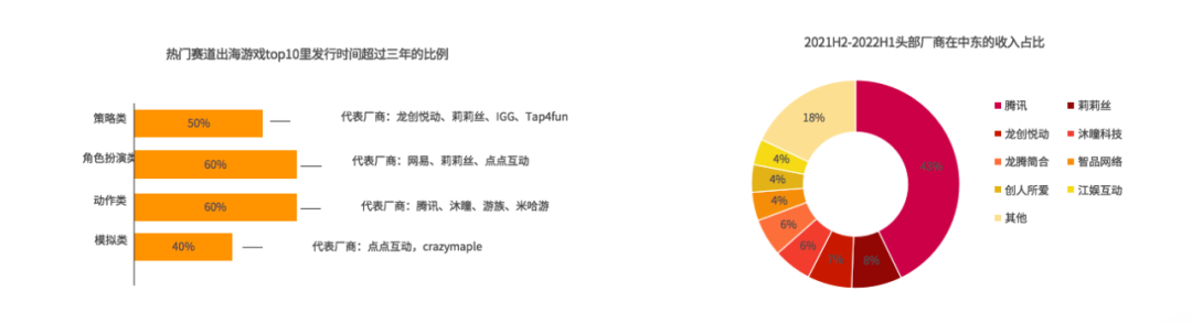 出海中东的头部厂商主要分为两种类型:一种是以强大的全球性研发运营能力,生产全球化的重度游戏,如腾讯、莉莉丝等,以动作射击、MMOROG、策略类游戏为主;另一部分是以中东目标市场,通过精细的用户研究以及本土化运营的龙创悦动、龙腾简合等,以策略、棋牌、休闲等游戏为主。