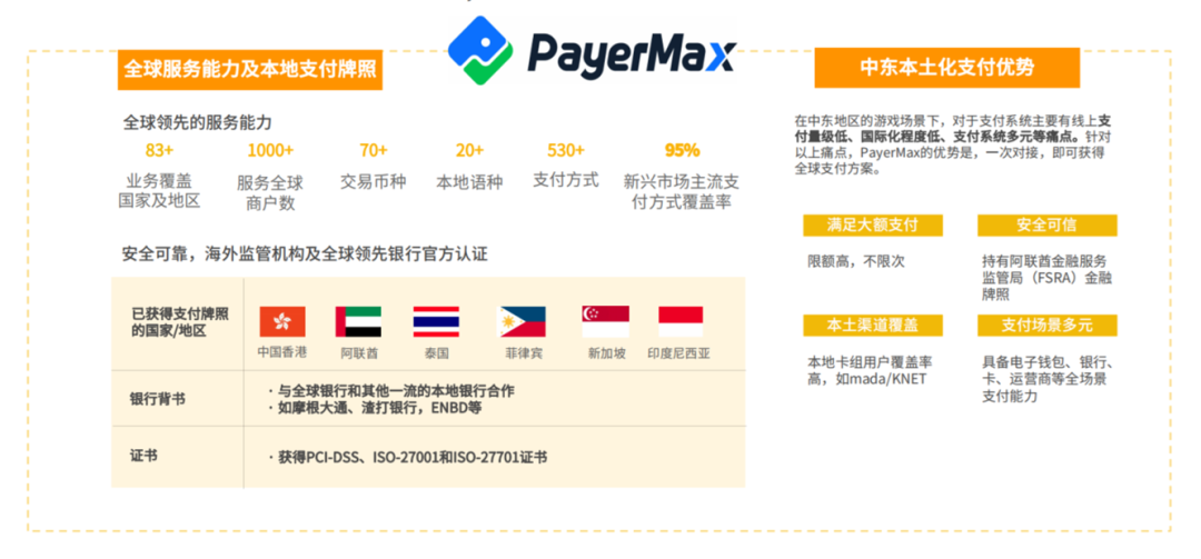 植根新兴市场,布局全球业务的金融科技公司PayerMax,是第一家拿到阿联酋支付牌照的亚洲背景的公司,同时也是第一个在沙特开出本地独立办公室的亚洲支付公司。其在中东地区支持多个本土化支付场景,持有本土权威牌照支持,在适应中东游戏各种支付场景和支付渠道的基础上,有力保障用户的安全与便捷性,是中东地区稳健的支付基础设施,能够为游戏厂商出海中东保驾护航。