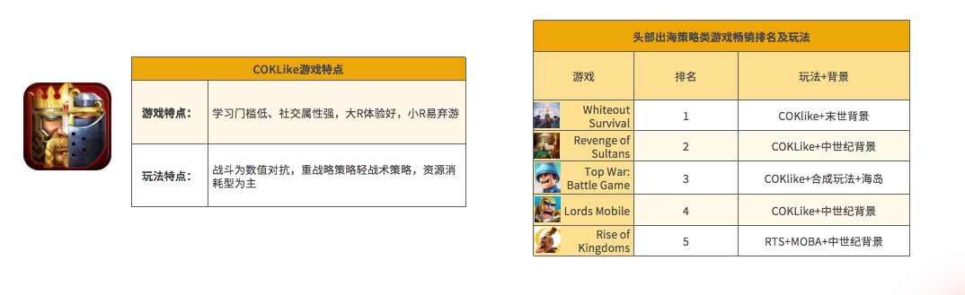 SLG游戏主流玩法共分为四种类型,其中又以列王的纷争(即COKLike)为目前的主流。中东地区更适合COKLike类型的游戏——因为逻辑简单直白,玩法学习成本低,容易留住大R玩家;但也同质化,玩法创新少。