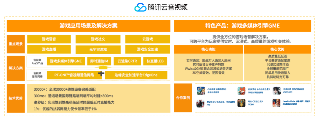 在这方面,腾讯云音视频是最具代表性案例,其拥有业界最全音视频产品矩阵。针对中东游戏市场的重语音实时社交需求高的特征,腾讯云音视频基于20多年的通信技术积累,提供覆盖全球2800+加速节点、端到端时延<300ms、全球联防能力达10 Tbps+的RT-ONE™音视频通信网络和边缘安全加速平台,致力于为全球泛娱乐应用提供低延时、低门槛、稳定的音视频解决方案。