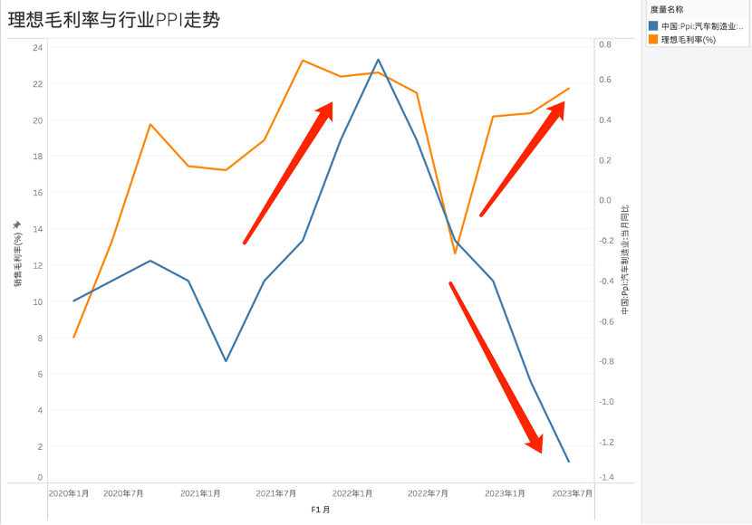 带着上述分析框架,我们再看理想汽车与行业PPI的表现。作为汽车行业后起之秀,理想在创业之初是无法规避行业“系统风险”的,在上图中最初理想的毛利率与行业PPI也呈现强互动关系,直到2023年之后两条折线走势开始分化,理想毛利率仍处于修复期而行业PPI已经急转直下了。