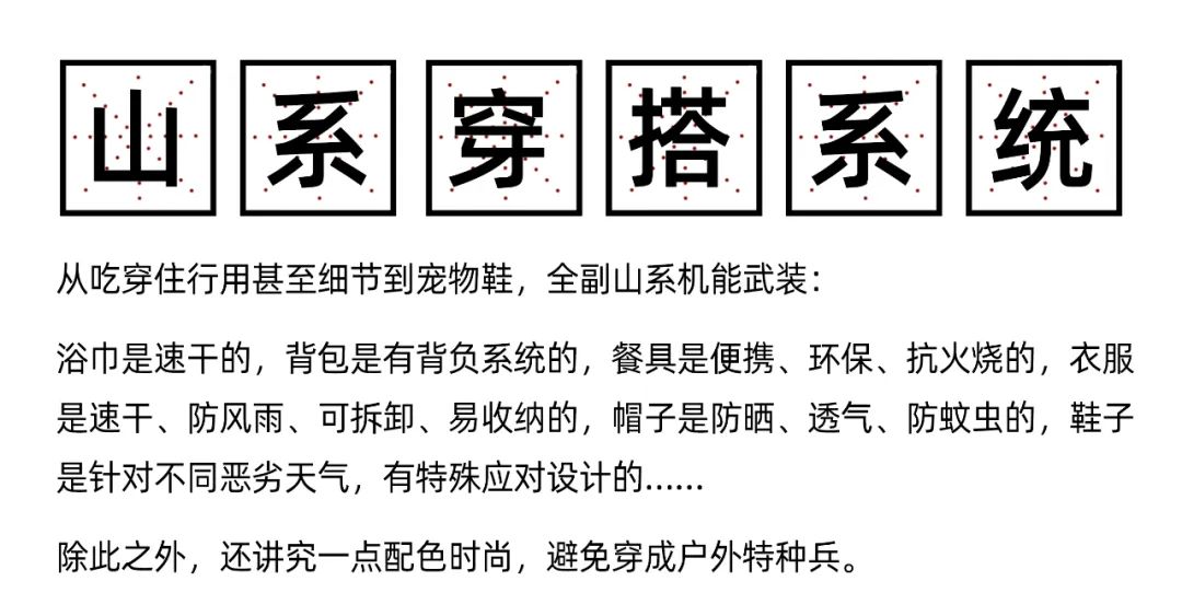 “有人说山系不过是花钱穿一堆化学合成材料,山系单品不一定是最舒适的,但每一样功能,在用到的时候都不会觉得华而不实。就像买越野车的人,真不一定是为了越野,有可能只是为了玩姿态,这一点卖越野车的品牌的也知道。但在比起去真正的荒野,谁说这又不是放松?”