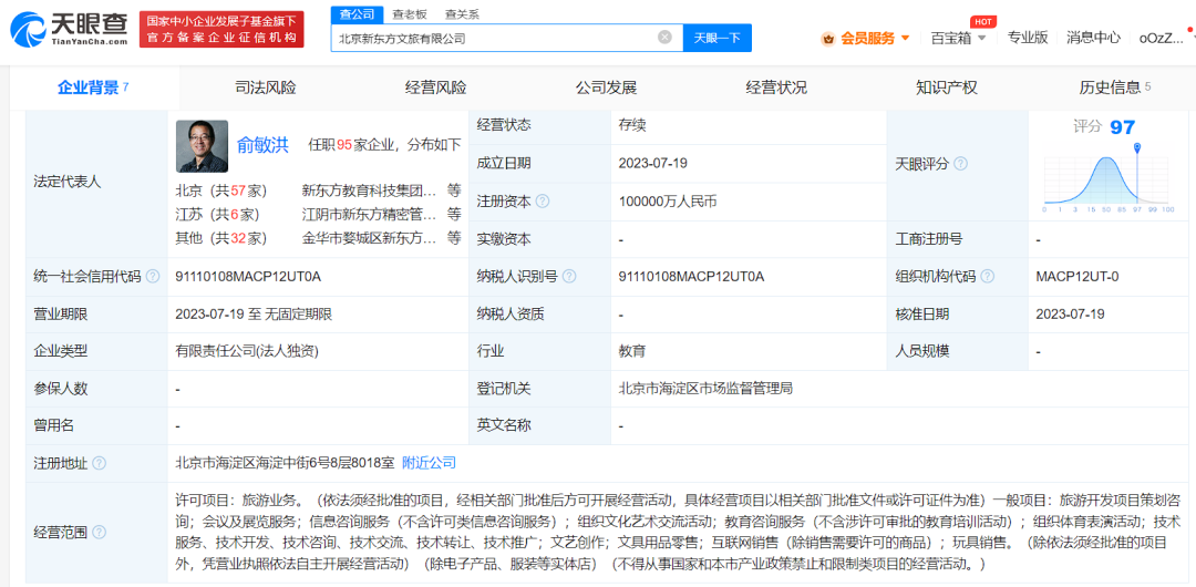 就在不久前,北京新东方文旅有限公司成立,注册资本 10 亿元,由俞敏洪担任法人,经营范围包括旅游业务、旅游开发项目策划咨询、组织文化艺术交流活动等。此前,新东方曾在“东方甄选看世界”直播间对文旅产品进行带货,4月,俞敏洪曾公开表示东方甄选接下来将布局文旅行业,未来培养一批能讲课的导游。