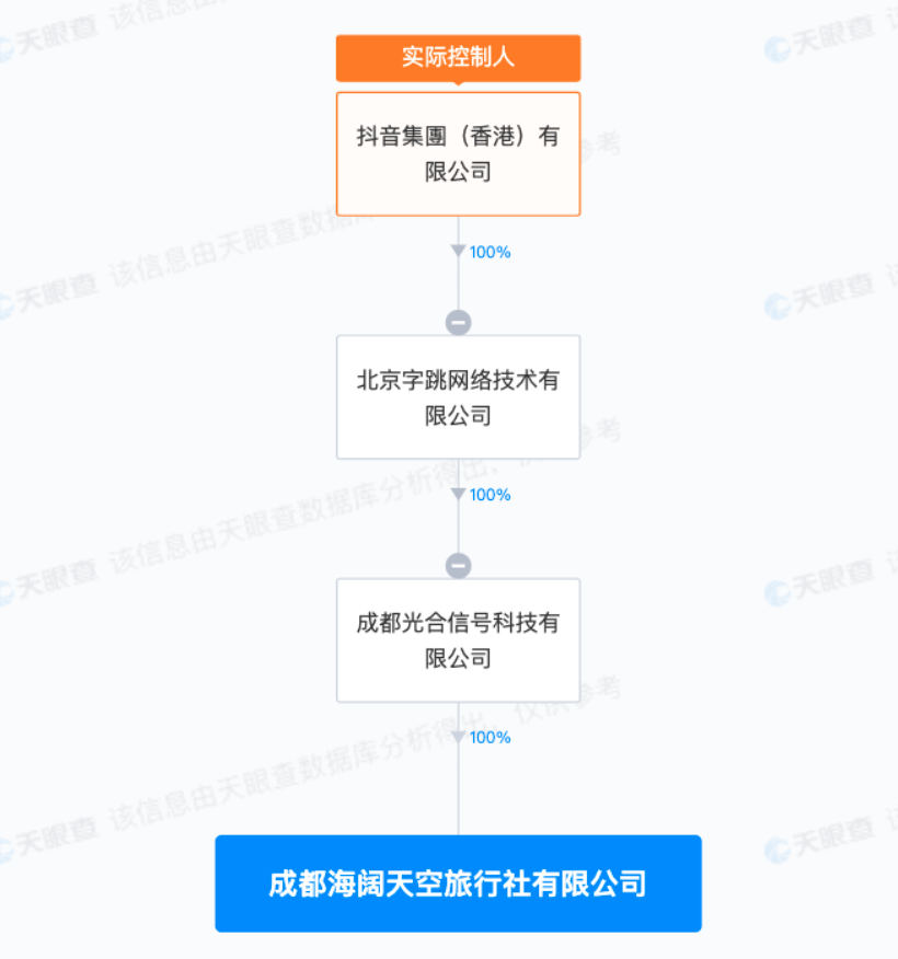 成都海阔天空旅行社有限公司悄然成立,却引来了密集关注。天眼查股权穿透显示,这家旅行社背后,抖音才是真正的“幕后大佬”。这被认为是抖音要“亲自下场”旅游行业的一个重要信号。