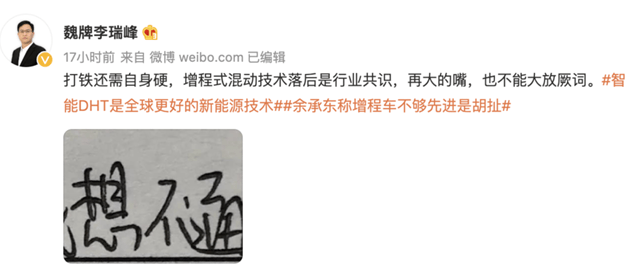 在2020年,时任大众中国CEO冯思翰称增程是“最糟糕的方案”。国内车企也在不停地对增程式技术发起质疑,长城旗下魏牌CEO李瑞峰曾发微博称“增程式混动技术落后是行业共识”。