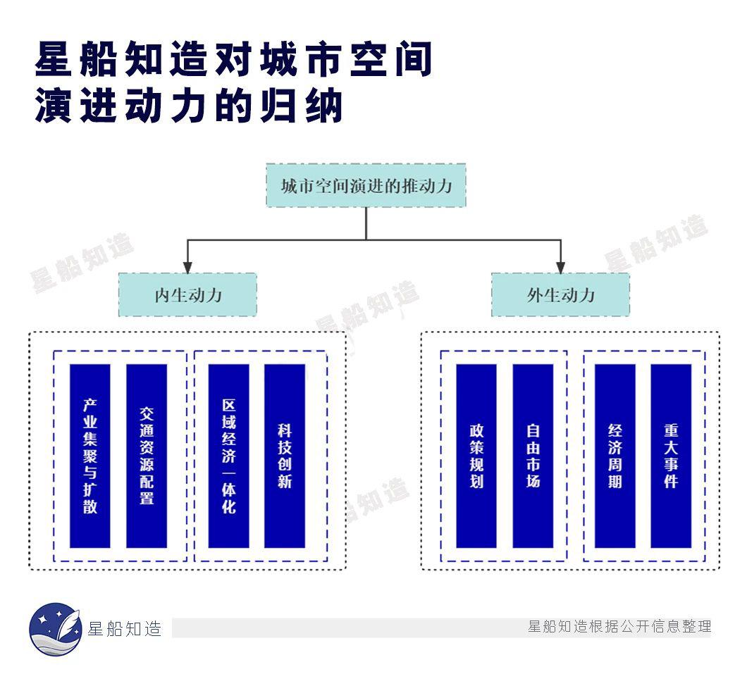 星船知造对城市空间演进动力的归纳。政策与市场共同作用于城市空间的拓展。